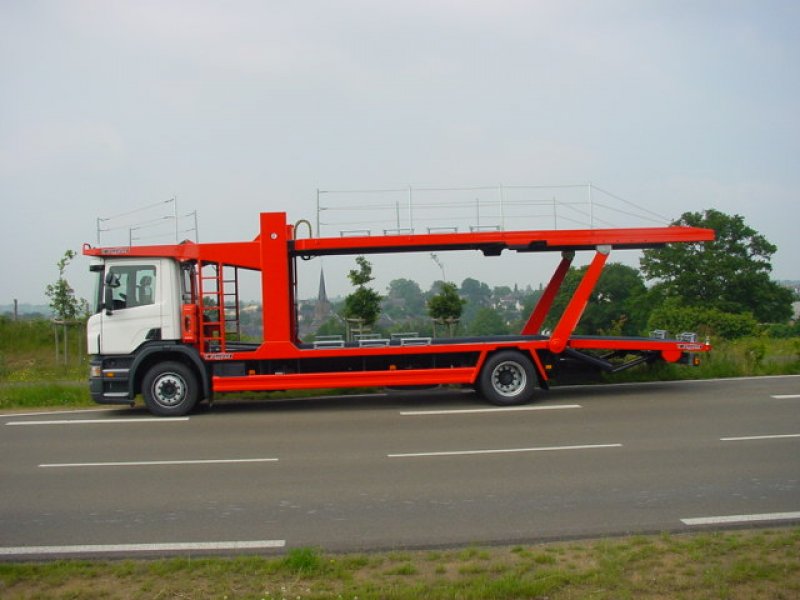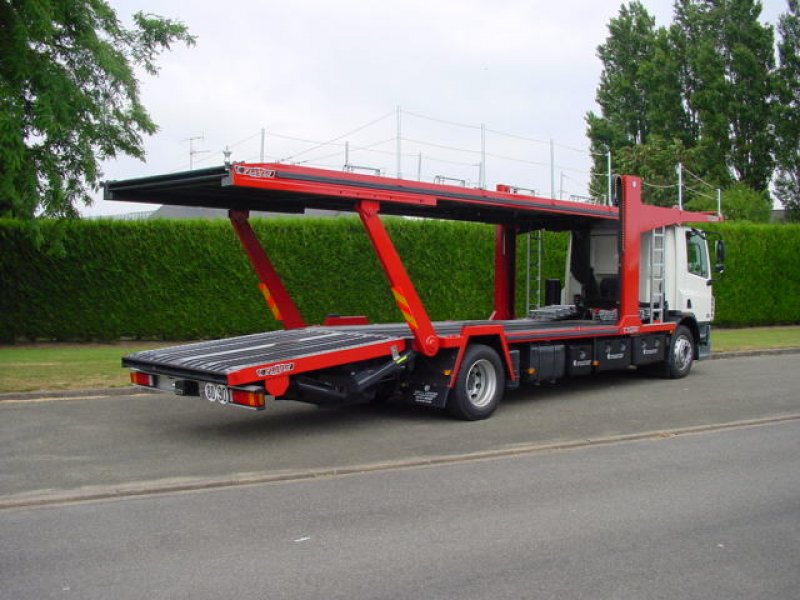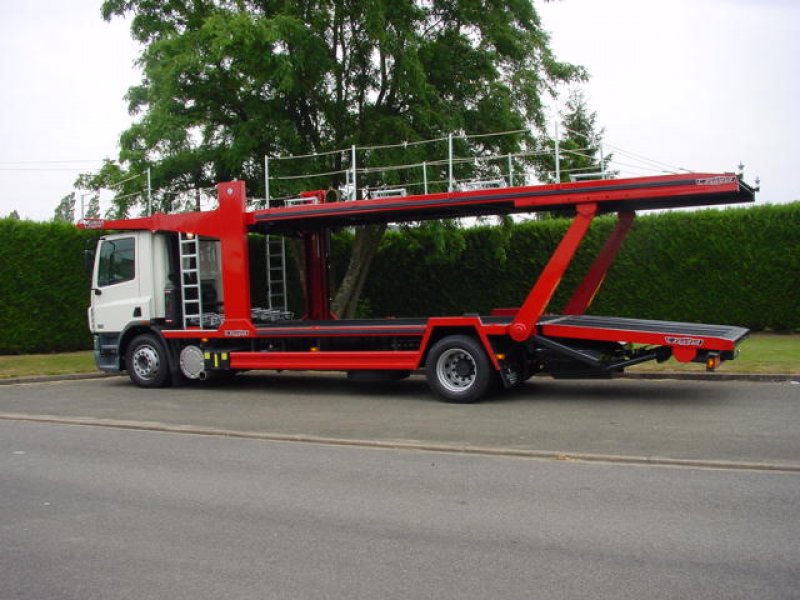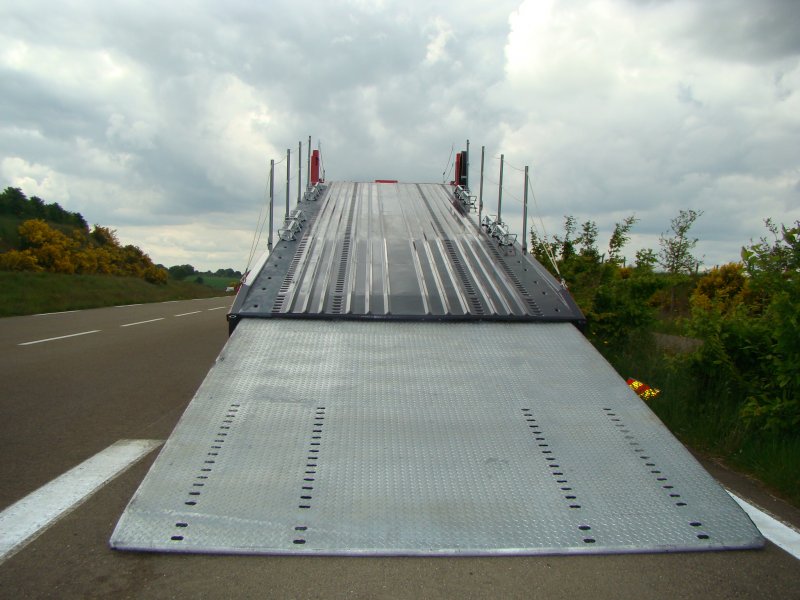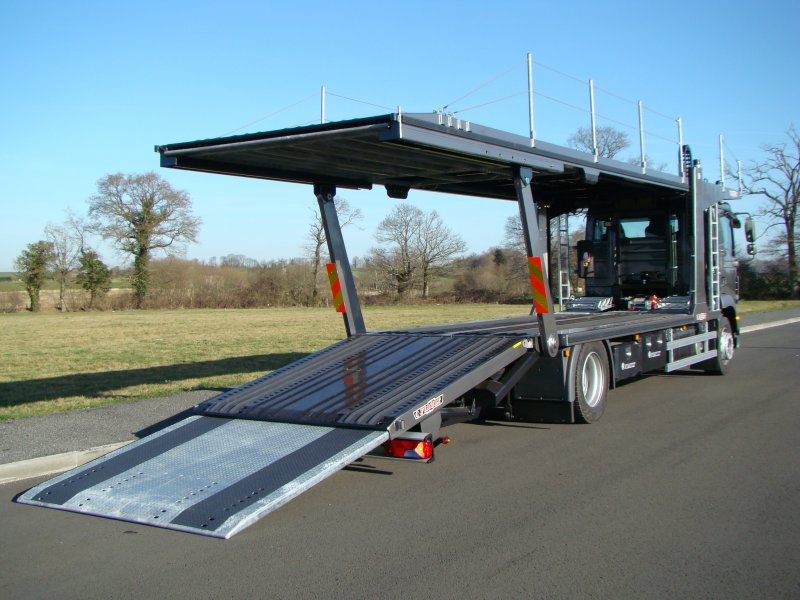 Stacking system for a 6th car with hinge on the back of the cab and rear lift with 2 hydraulics cylinders and an additional adjustment of length following the wheelbase of the vehicle with a hydraulic central cylinder by remote control and combined with 2 floor pits hinged and lowered with 2 hydraulics cylinders controlled on manual distributors (on 26T chassis cab)