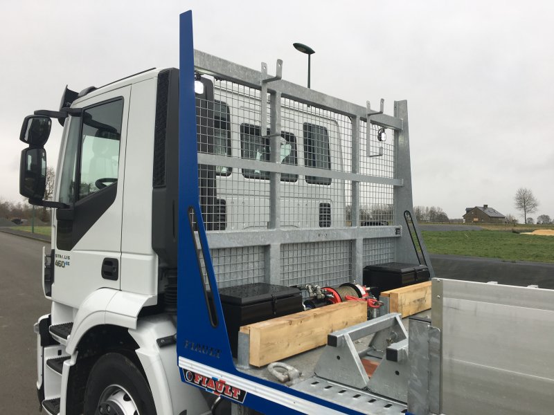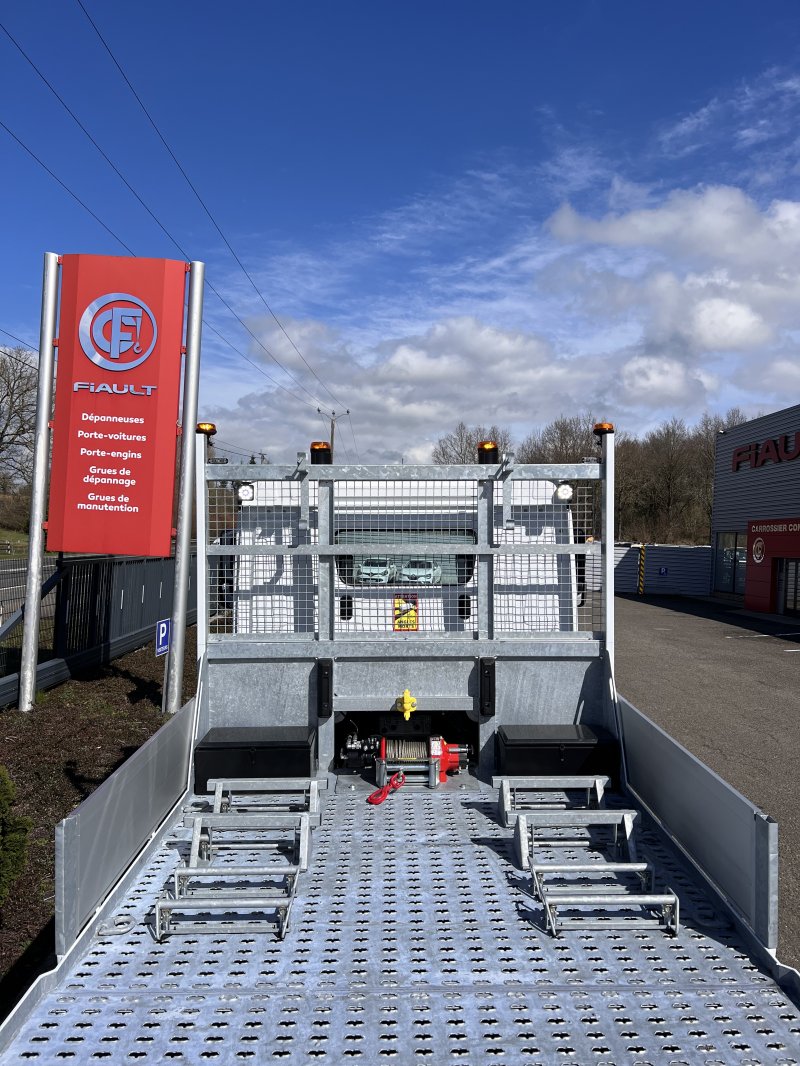 High front bar special Public Works with steel plate in lower part and protective grating of cabin in high part, 2 tool boxes on each side of the winch and 2 protective wooden board