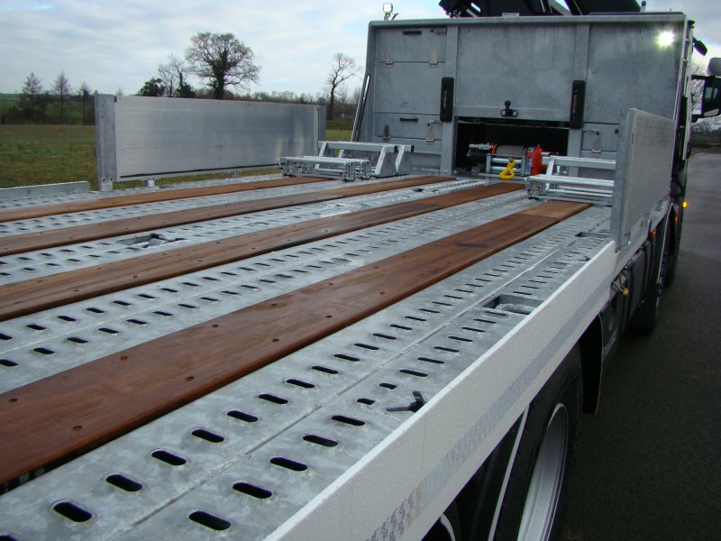 Replacing the sheet steel anti-slip load bed with perforations for fixing blocks by a mixed 5 steel strips + 4 wood floor strips of 215x35 with the possibility of stretching over the entire length and over the entire width