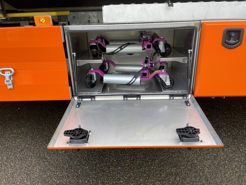 A special motorcycle wedge with an articulated and adjustable shoe for fitting the wheel, 2 ratchet straps, 1 short traction sling, 1 special motorcycle handlebar strap and a storage rack on the equipment