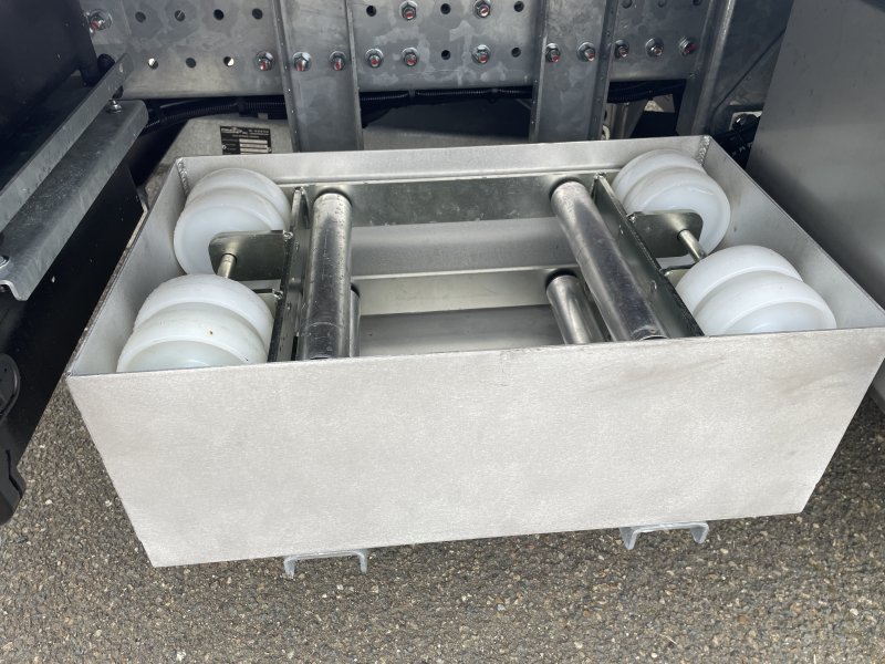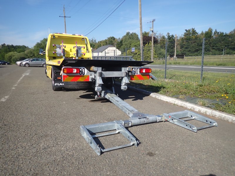 A 2 tons SCC type “AUTOLIFT” galvanised with hydraulic elevation and extension 1200 mm, removeable and adjustable galvanised lift forks, two rollers mounted under the deck, hitch ball diam. 50, two ratchet type straps to secure wheels to the deck