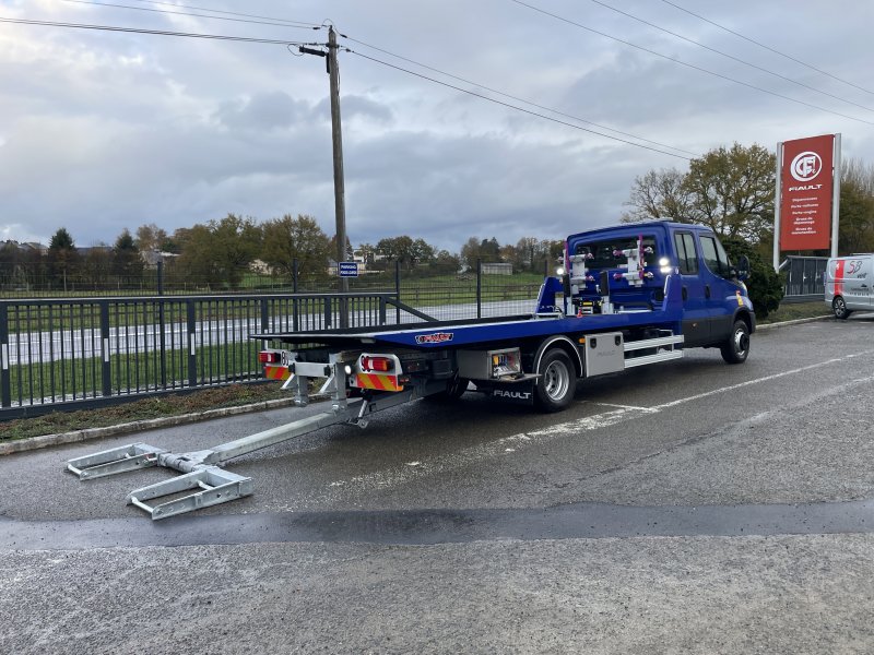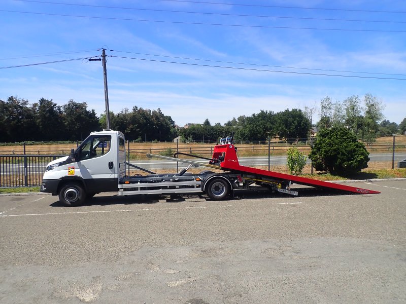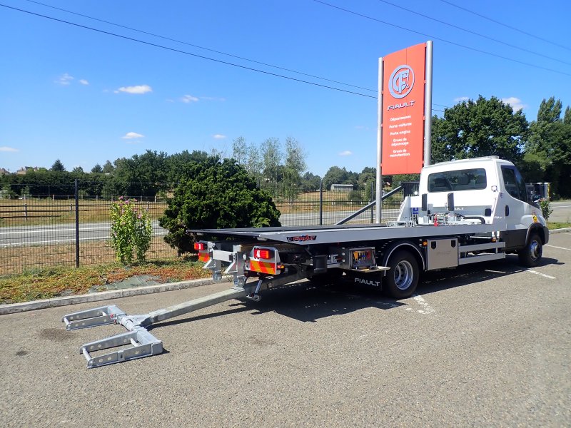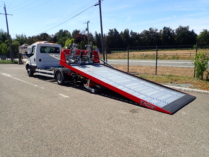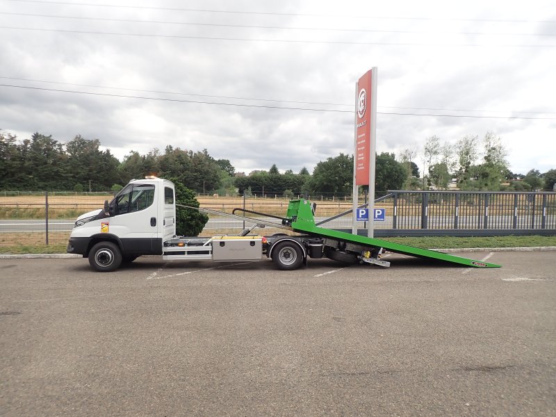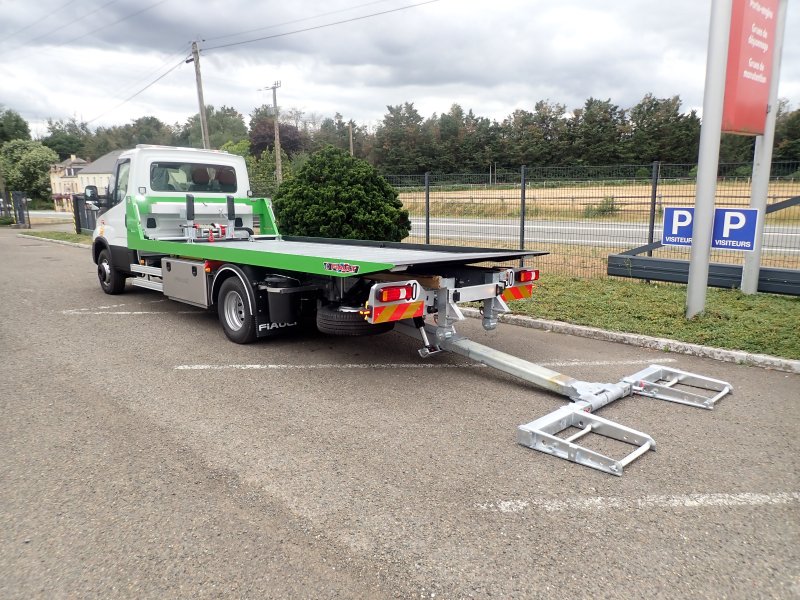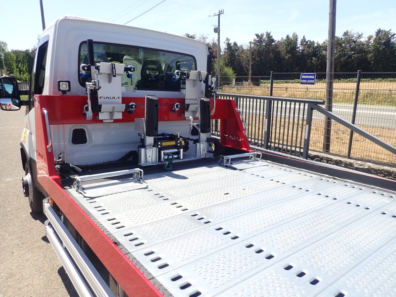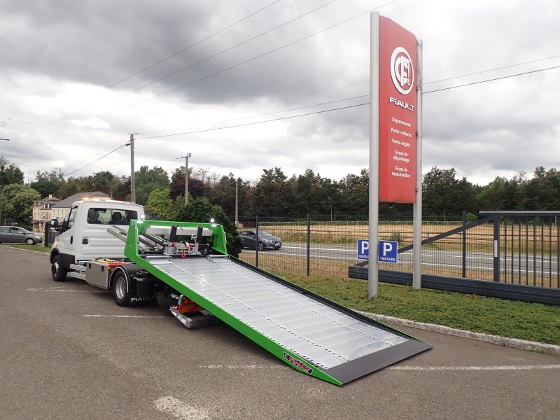The PLAT'TRANS PF30 steel is a tilting and sliding car transporter designed for chassis cabs from 5 to 8 tonnes. Thanks to its steel construction, it offers greater strength, ideal for transporting heavier vehicles. Equipped with an integrated towing basket, it can carry up to two vehicles simultaneously.