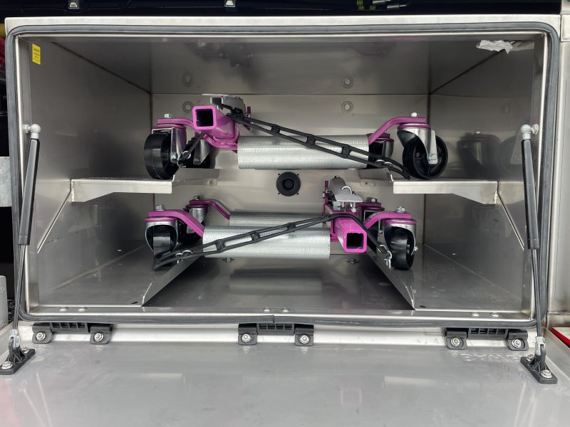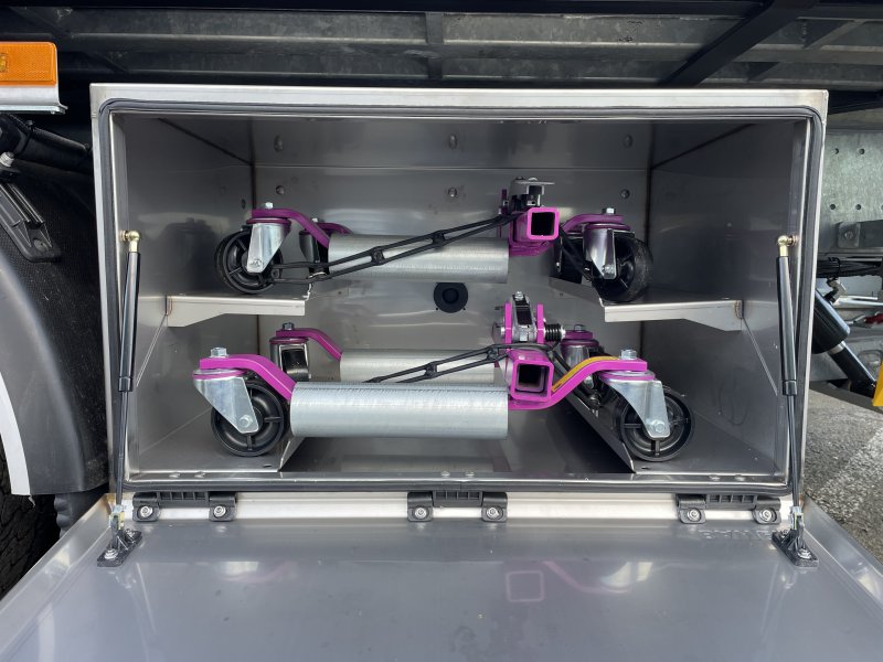 Two special EASY WHEELS free-wheel loading trolleys for vehicles with locked wheels or all-wheel drive, with a bar for lifting the vehicle and a support plate for vehicles without wheels (without support) (maximum speed: 5 km/h) (to be placed in a 1000 mm toolbox, not included)