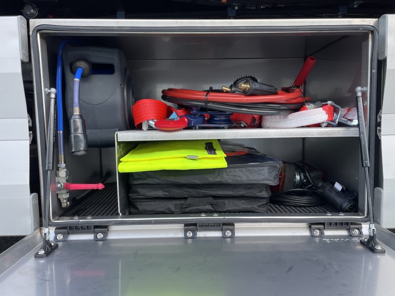 Stylized aluminum body in the wheelbase height 600mm with rear fenders in polyurethane (for chassis from 12T to 32T, with tool box only opening from above behind the aluminum body) painted in a standard color RAL =