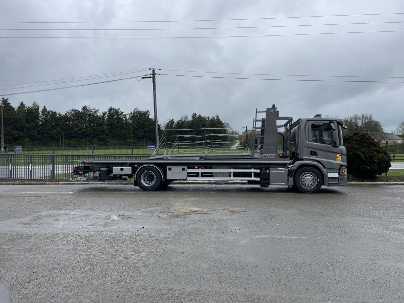 A 3 tons SCC type “Combilift” galvanised combination lift with hydraulic elevation and extension 1200mm, removeable and adjustable galvanised lift forks, crane head with pulley and two rollers mounted under the deck, hitch ball diam. 50, two ratchet type straps to secure wheels to the deck
