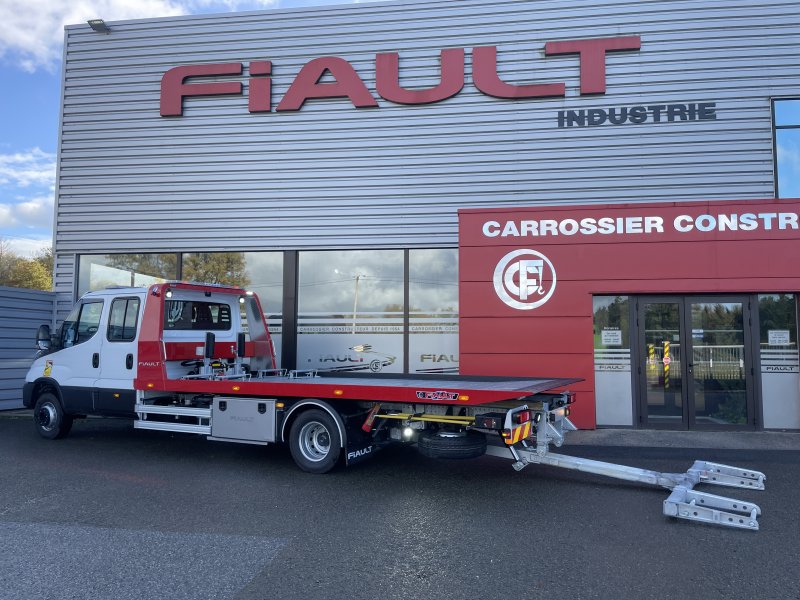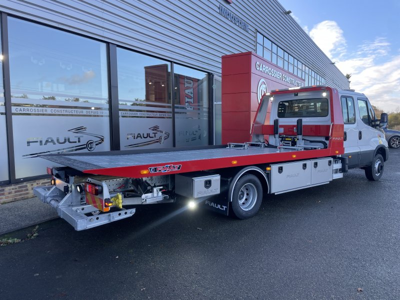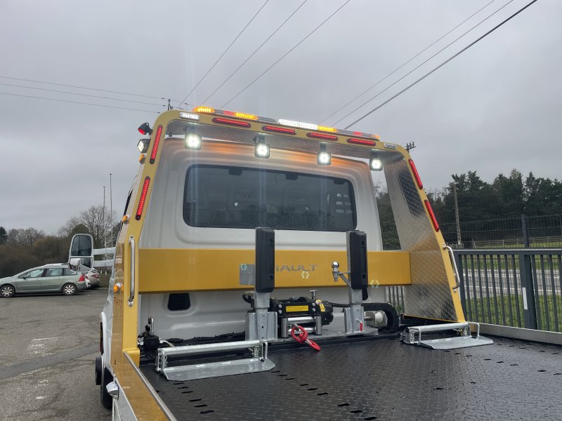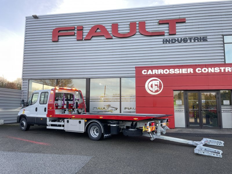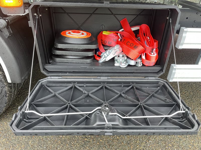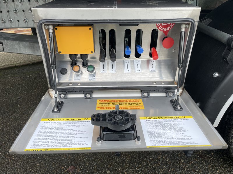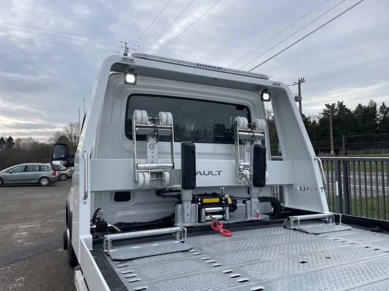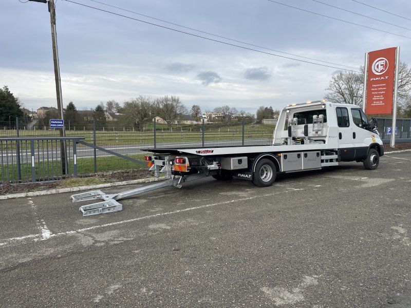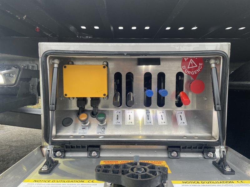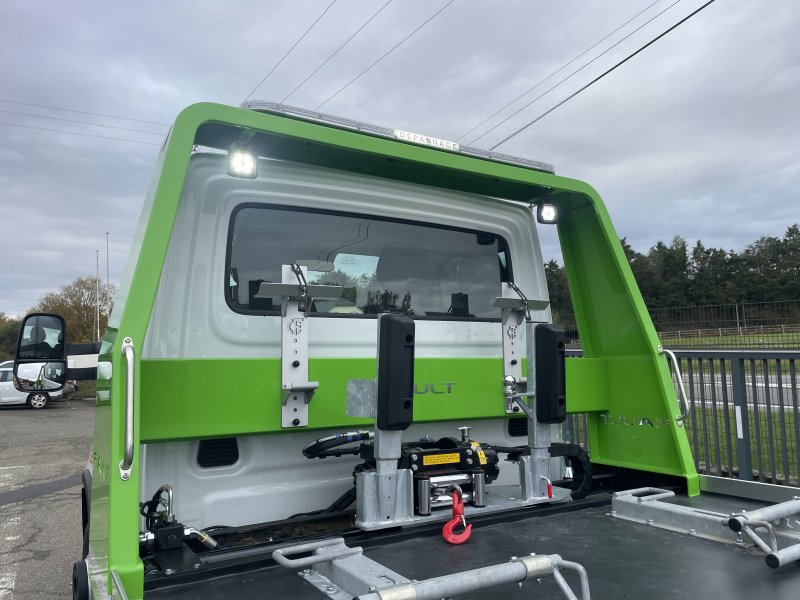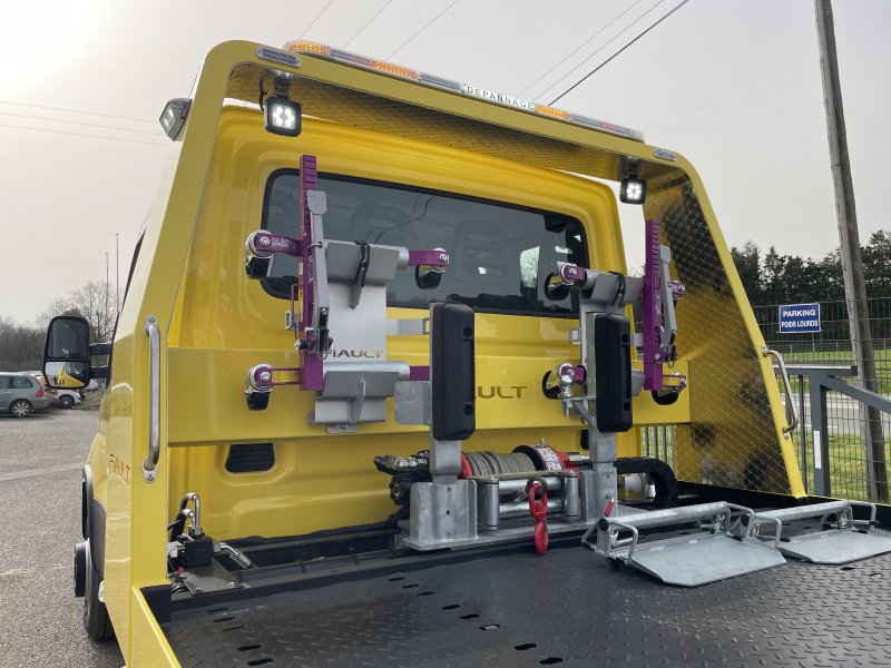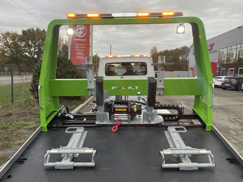 Un treuil hydraulique 3T6 avec 20 m de câble diam. 10, guide câble, installé sur le panier de remorquage avec une commande radio couplée avec le treuil du plateau. Un crochet d'attelage double chape+ boule adaptable sur la traverse du panier avec 2 broches