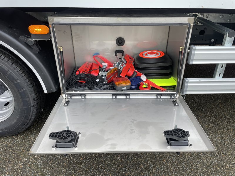 Une cale spéciale pour moto avec un sabot articulé et réglable pour emboîtement de la roue, 2 sangles à cliquet, 1 élingue courte de traction, 1 sangle spéciale moto pour guidon et un support de rangement sur l'équipement