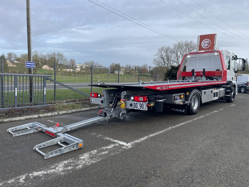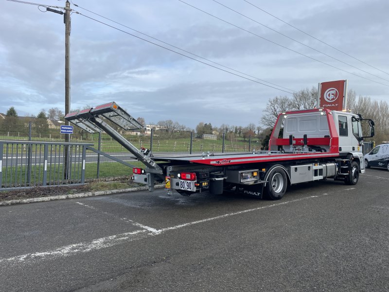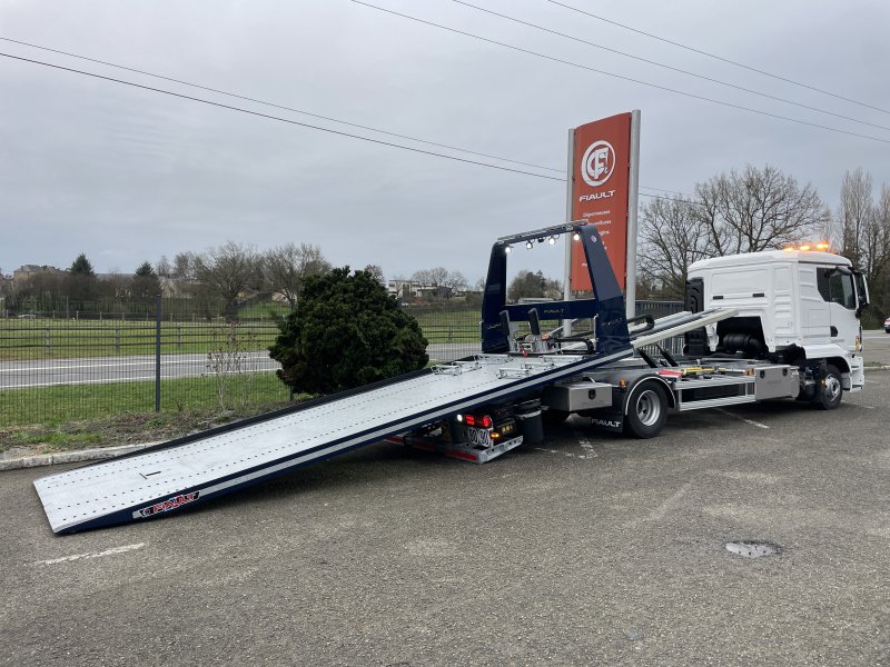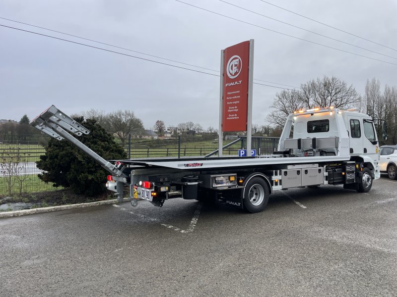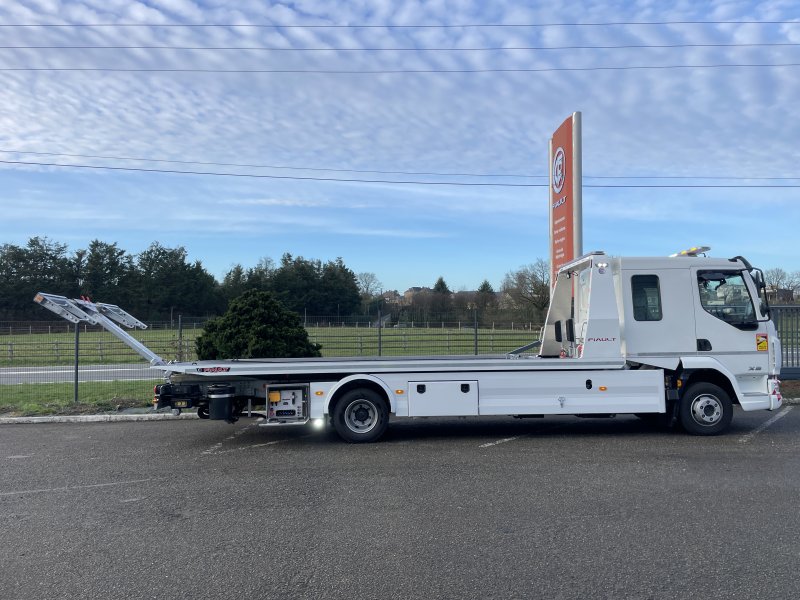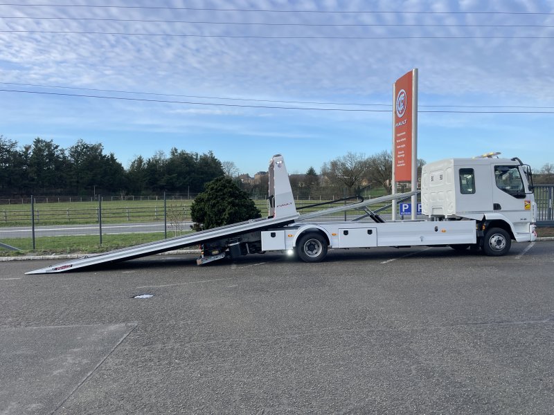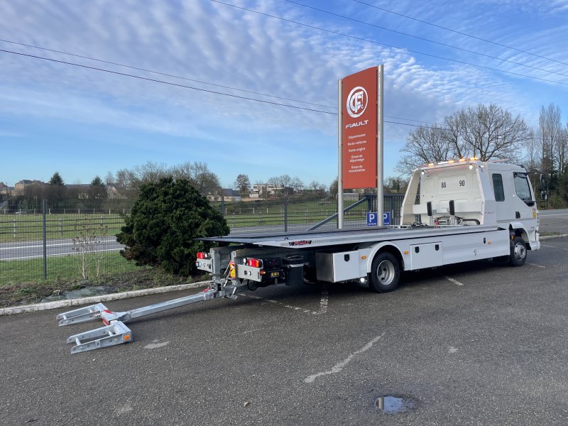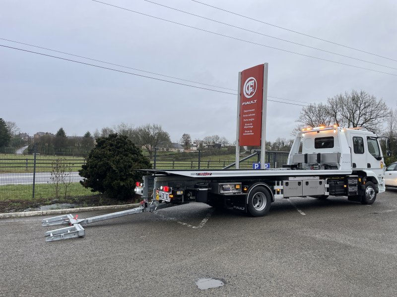 Double extension hydraulique du panier à 1800 mm pour permettre l'utilisation des rampes (PF60-PF65). Suppression de la trappe à l'arrière du plateau. Cette double extension permet également de prendre des véhicules au panier avec un porte à faux avant et arrière très long.