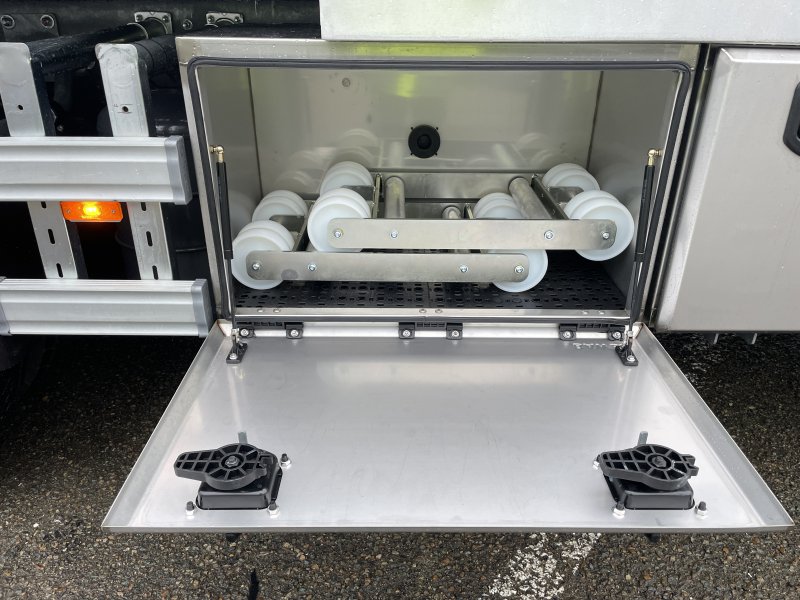 Porte à faux arrière en polyester (sans ailes) avec un coffre pour les commandes hydrauliques à l’arrière droit et un coffre à outils à l’arrière gauche avec portes articulées (pour châssis de 10T à 32T), peint en un ton uni standard (non métallisé) idem aux carénages