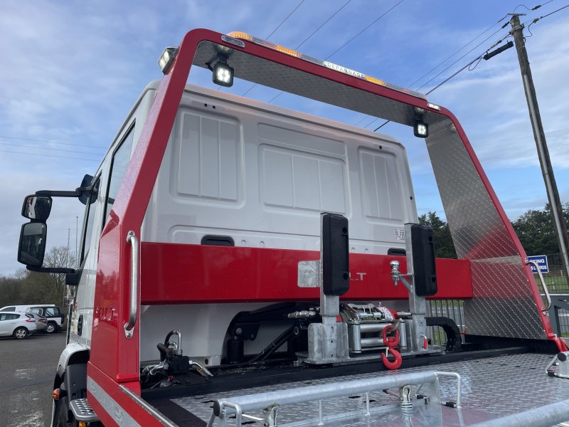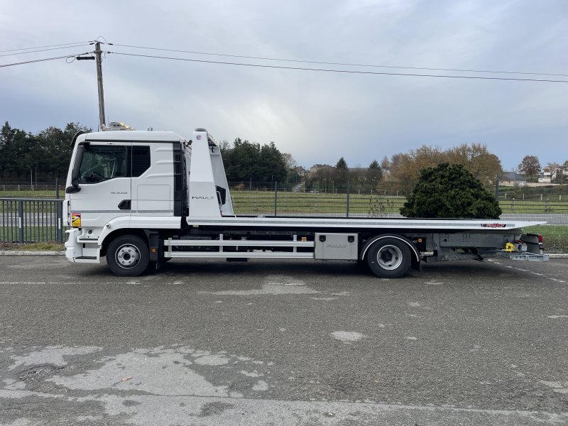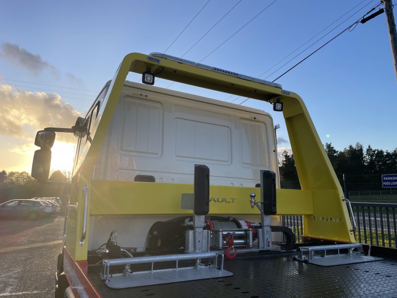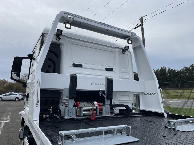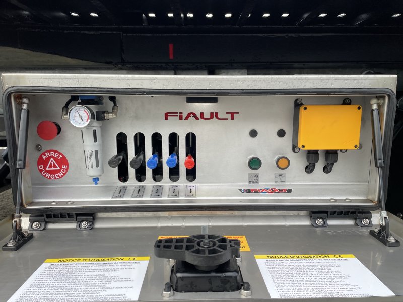 Un treuil hydraulique 3T6 avec 20 m de câble diam. 10, guide câble, installé sur le panier de remorquage avec une commande radio couplée avec le treuil du plateau. Un crochet d'attelage double chape+ boule adaptable sur la traverse du panier avec 2 broches