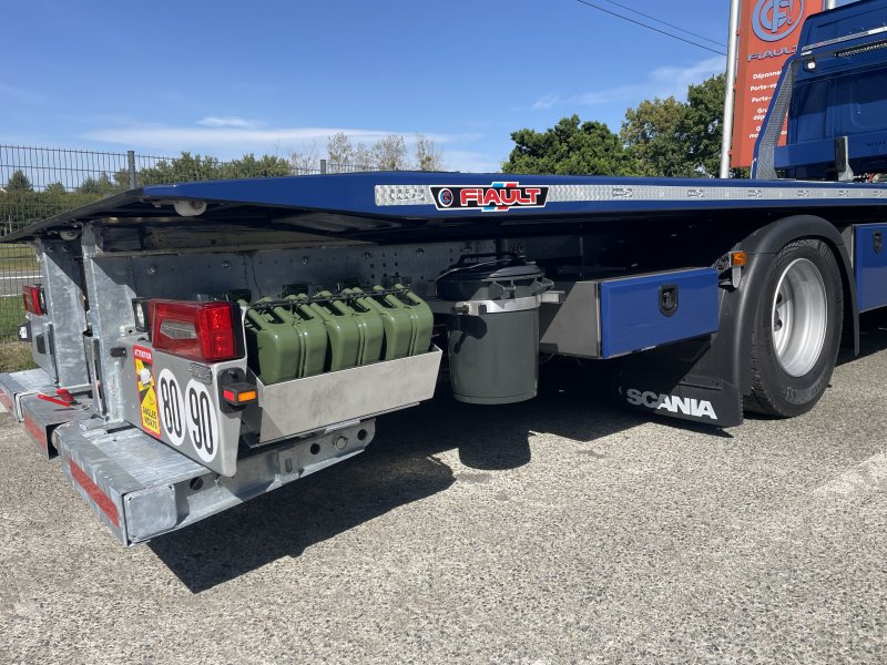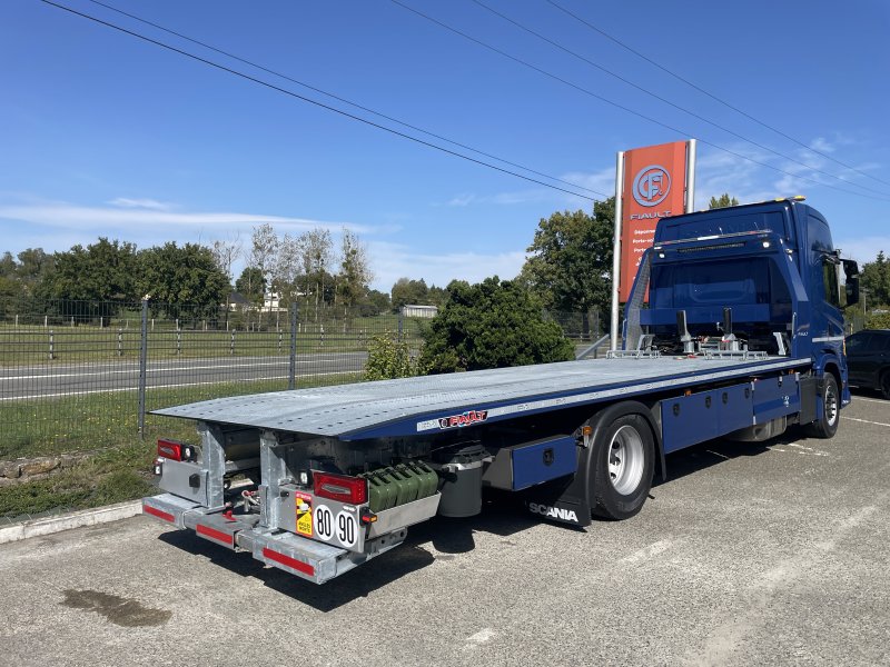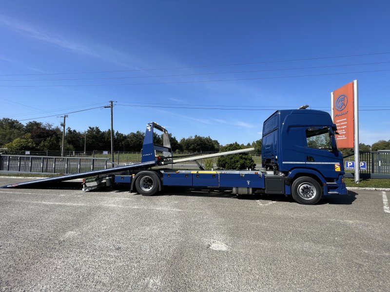 Double extension hydraulique du panier à 1800 mm pour permettre l'utilisation des rampes (PF60-PF65). Suppression de la trappe à l'arrière du plateau. Cette double extension permet également de prendre des véhicules au panier avec un porte à faux avant et arrière très long.